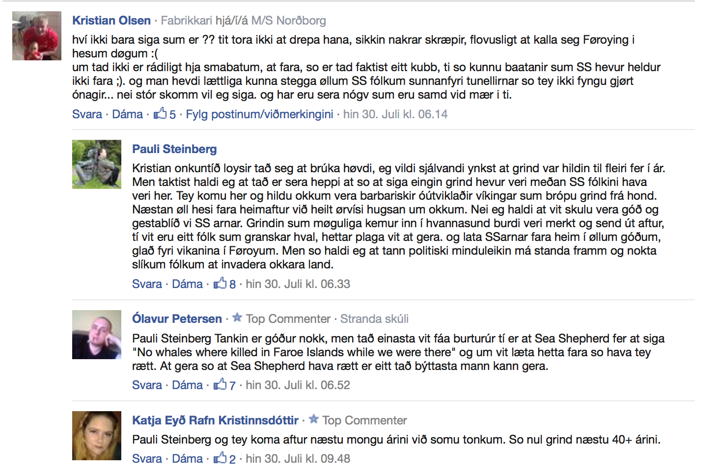 Paul Watson then spent several paragraphs mocking the mayor for misspelling the name of the organization on the signs, where it was written “Sea Shepard.” As far as I know, Paul Watson does not speak or read Faroese, but he felt that it was fair game to mock a Faroese person’s spelling in English.