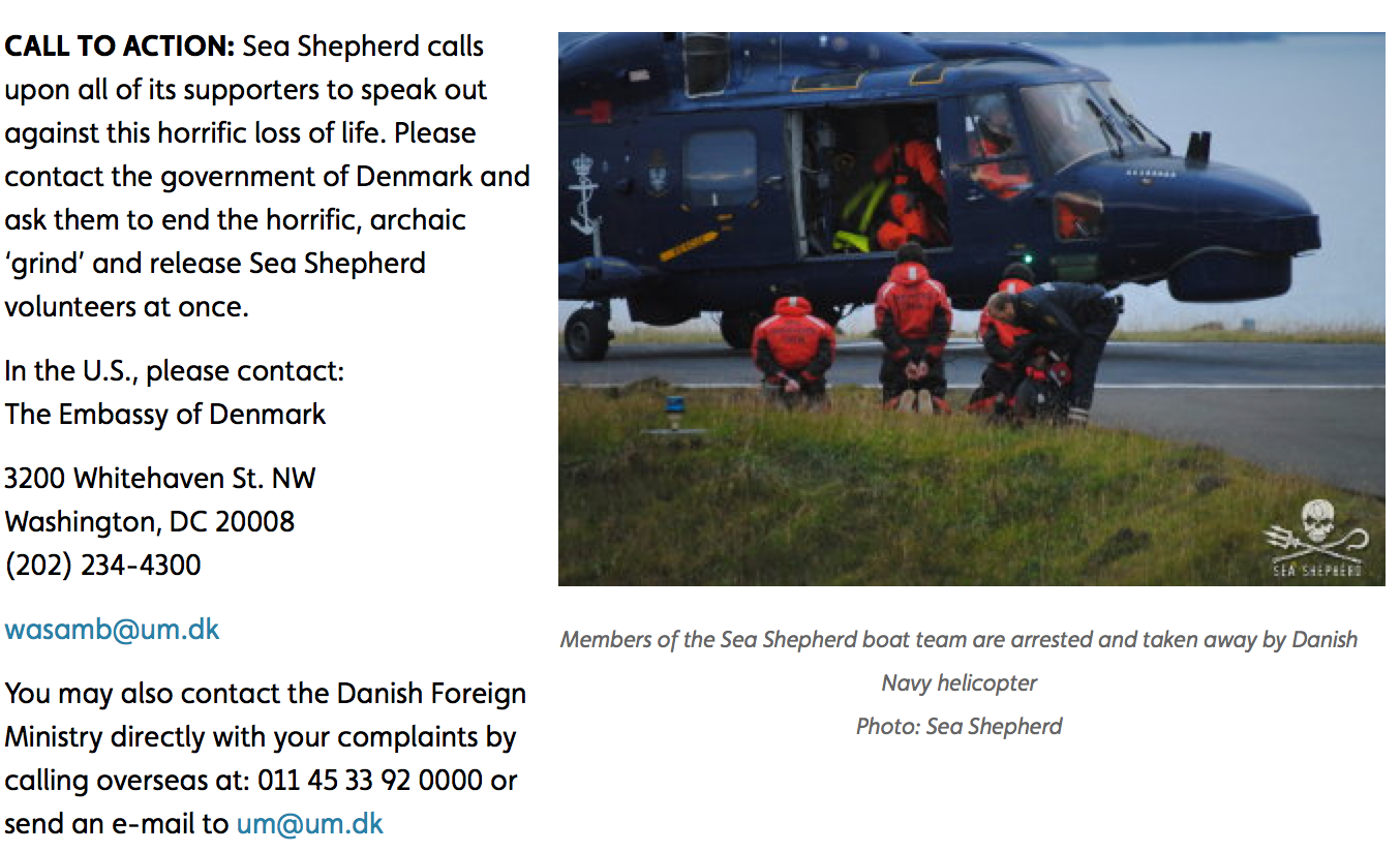 “Despite being a member nation of the European Union and subject to laws prohibiting the slaughter of cetaceans, Denmark has officially shown its support of — and now direct collaboration with — the Faroese whalers by sending the Danish Navy to defend this archaic, mass slaughter of whales in the Faroe Islands alongside Faroese police.”