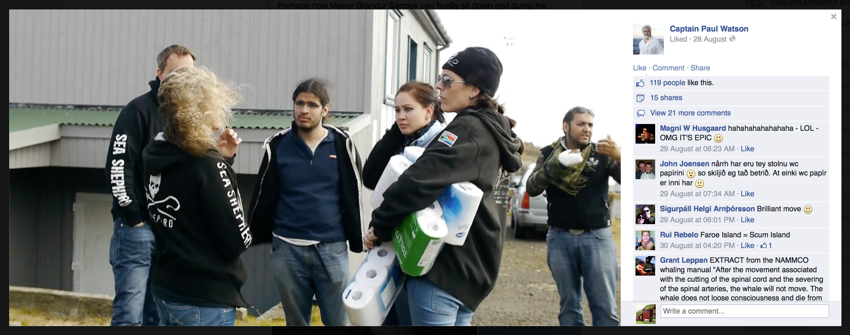 The Sea Shepherd members then bought 200 rolls of good toilet paper and tried to give them to the mayor of Sandoy. They claimed the move was a goodwill gesture, but the way Paul Watson wrote about it made it clear that it was intended to humiliate the mayor. He titled the post: