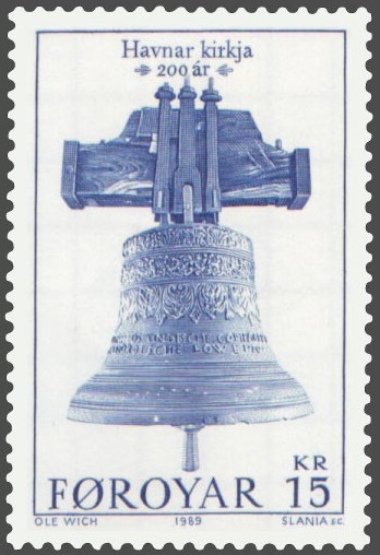 The bell in Tórshavn Cathedral, shown here on a Faroese stamp, was taken from the wreck of the Norske Løve.