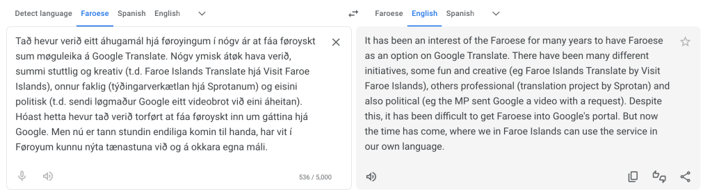 Once they are, it will be interesting to see how having a free translation service for Faroese changes the position of the language, particularly online. Until now, for example, there has essentially been no spam in Faroese. If you saw a message in Faroese, you could essentially assume it was genuine and that the person writing it actually knew the language. This will no longer necessarily be the case going forward.