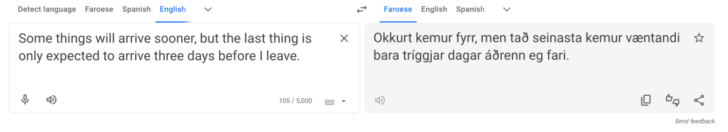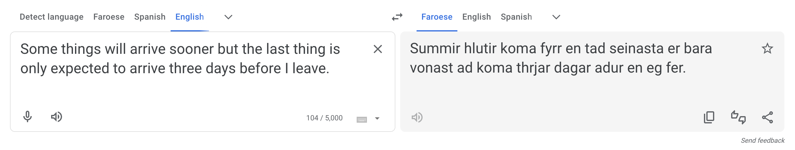 On the other hand, when I tried English > Faroese, I got some very Icelandic looking nonsense: